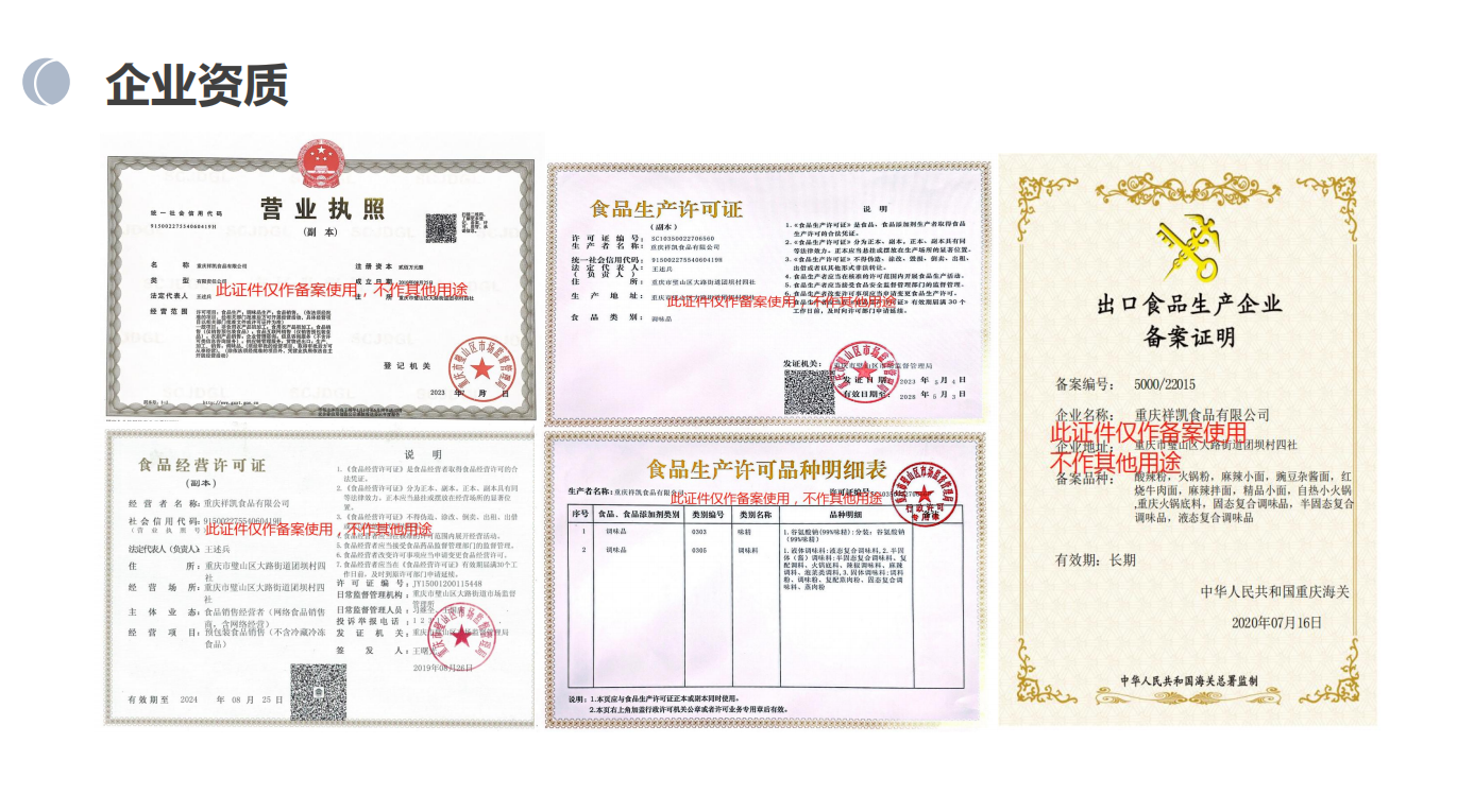 公司先后通過ISO三體系認證,知識產權認證,兩化融合A級認證,有系統的多層次員工培訓體系。2019年成為“示范食品生產企業”,2020-2023年被授予“區級農業產業化龍頭企業”,2022年獲得高新技術企業(證書編號GR202251101662),是重慶江湖菜發展促進會理事單位,重慶火鍋產業集團副會長單位,也是重慶輕工職業學院共建單位,重慶食品工業研究所合作單位。